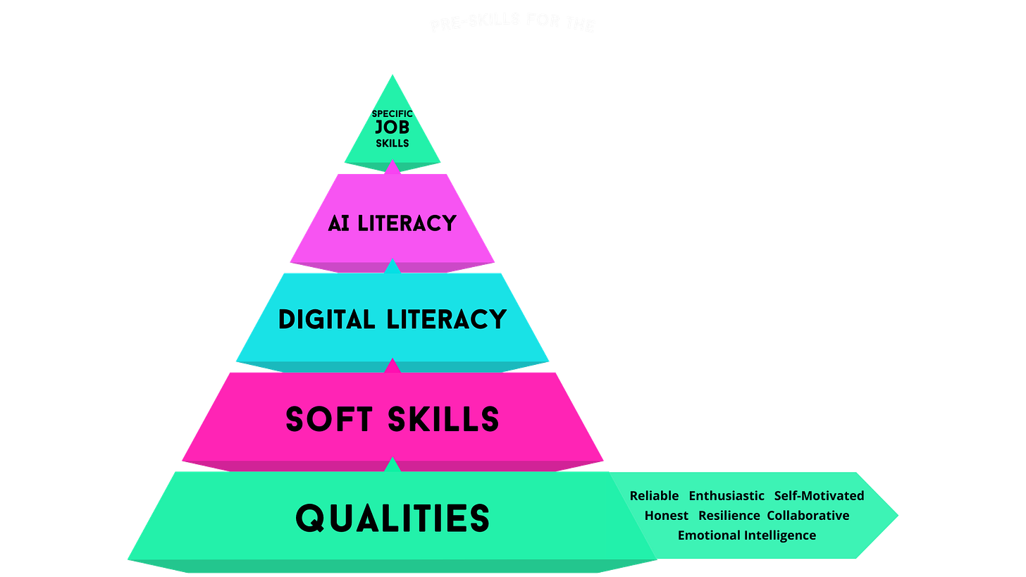 It supports young people to grow from personal qualities → soft skills → digital literacy → AI literacy → technical fluency.